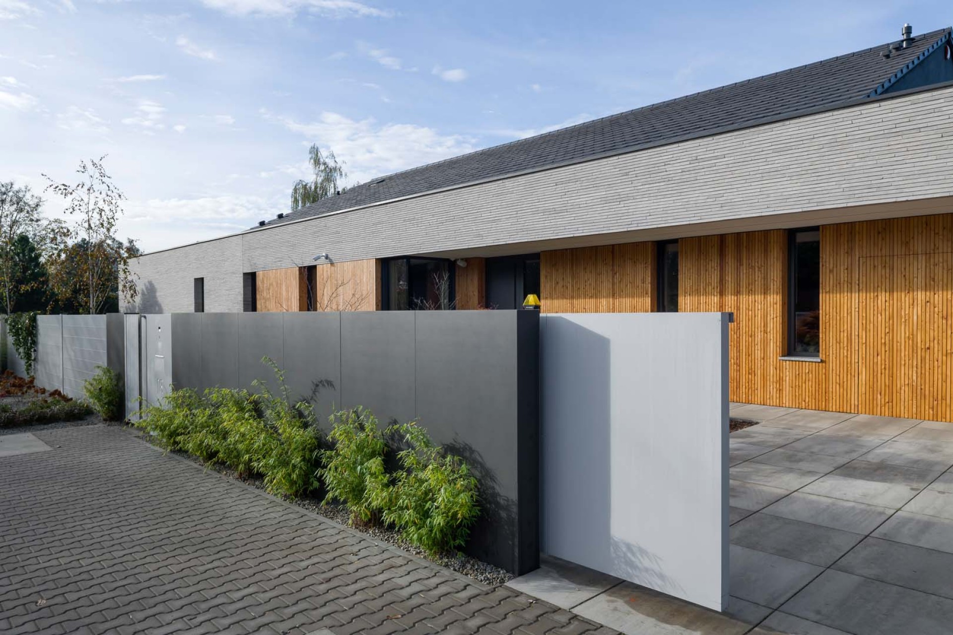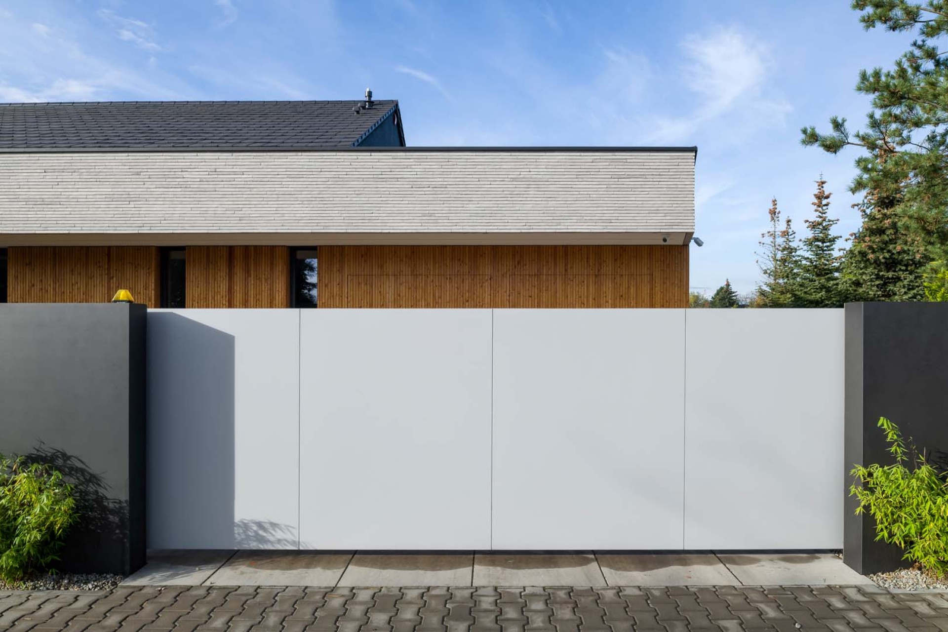 Das moderne Schiebetor wurde aus glattem Blech gefertigt, das farblich zum Rest des Zauns passt. Schnell und für hohe Belastungen geeignet, ist die Automatisierung mit dem Smart-Home-System kompatibel.