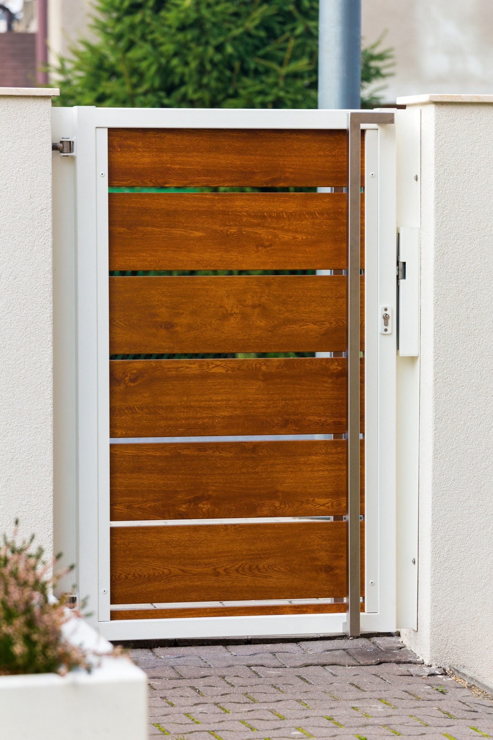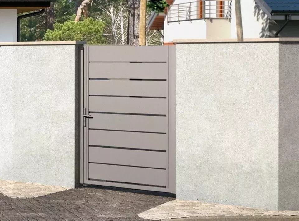 Die Basis für das Tor ist ein solider, geschweißter Rahmen, gefüllt mit Horizon Wood Zaunpaneelen. Die Konstruktion verfügt über verstellbare Scharniere und Edelstahlschrauben. Sie ist langlebig, stabil und widerstandsfähig gegen Beschädigungen. Die Pforte kann mit einem ästhetischen Griff oder einem minimalistischen Handlauf aus Edelstahl ausgestattet werden.