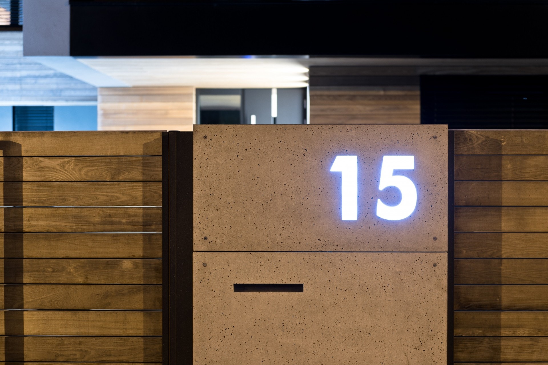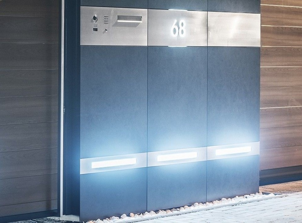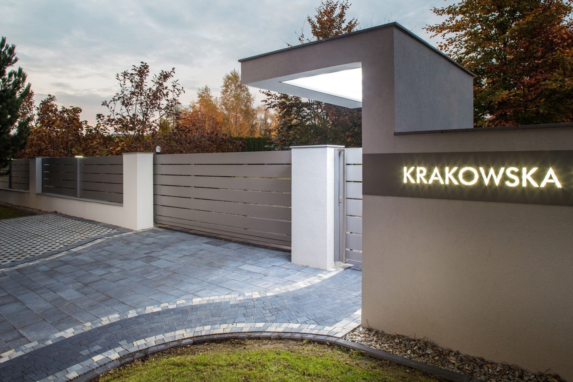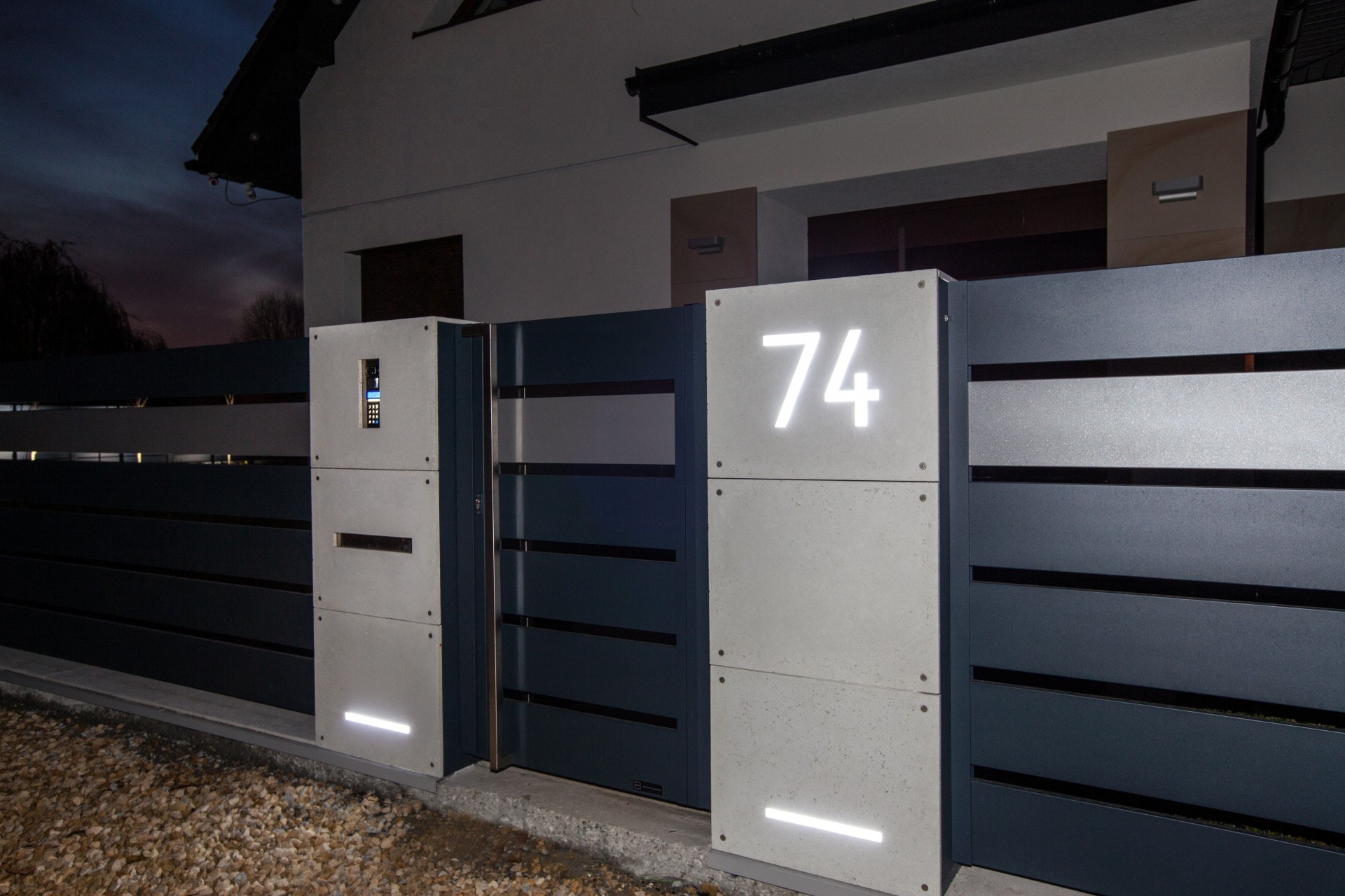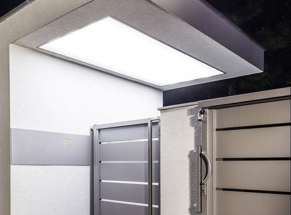 Das L-förmige Dach ist eine spektakuläre Abdeckung für den Eingang zum Grundstück. Im oberen Teil ist die Beleuchtung standardmäßig installiert.
