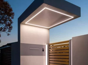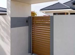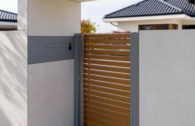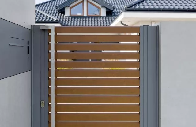 Das Tor besteht aus holzähnlichen Arete Rombo-Zaunelementen aus Aluminium, die auf einem grauen Rahmen montiert sind. Anstelle eines Griffs wurde ein Handlauf aus Edelstahl verwendet. An beiden Seiten wurde eine längs verlaufende LED-Beleuchtung installiert.