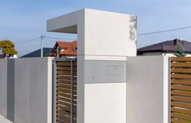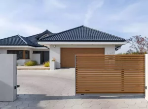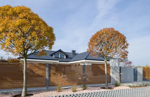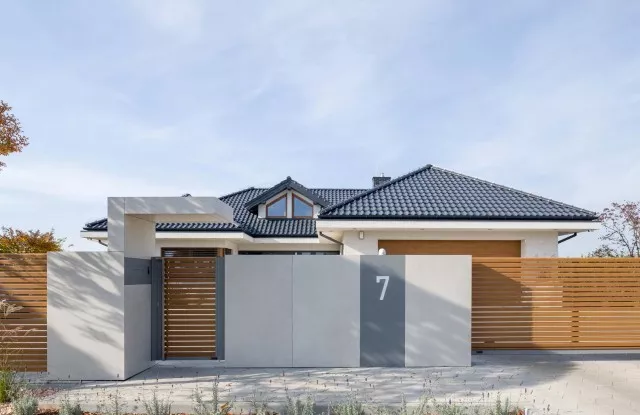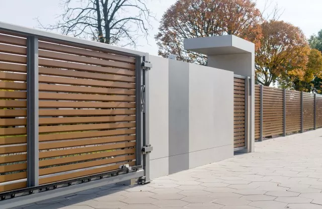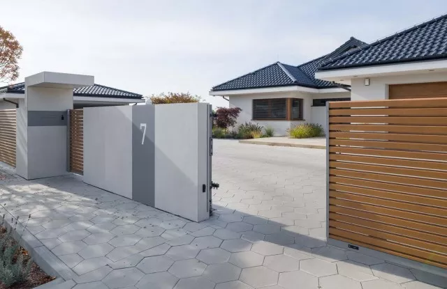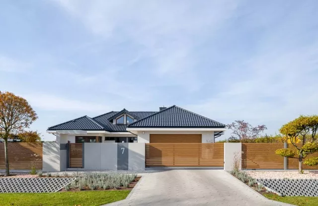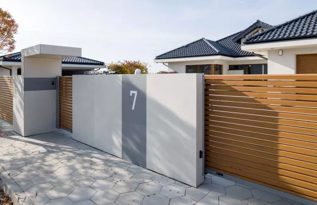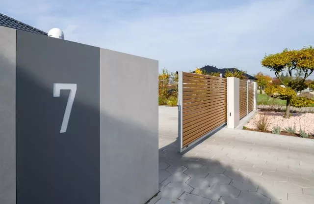 Der Rahmen des modernen Schiebetors ist mit holzähnlichen Profilen des Systems Arete Rombo gefüllt. Die schnelle Automatisierung ermöglicht ein reibungsloses und sicheres Ein- und Ausfahren. Auf beiden Seiten des Tors wurden LED-Streifen installiert.