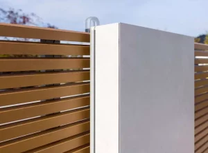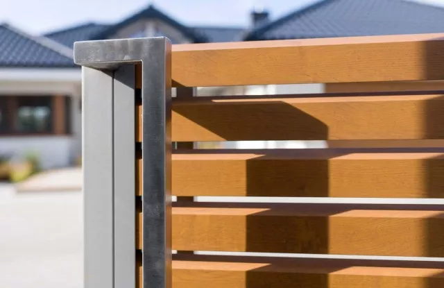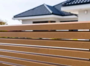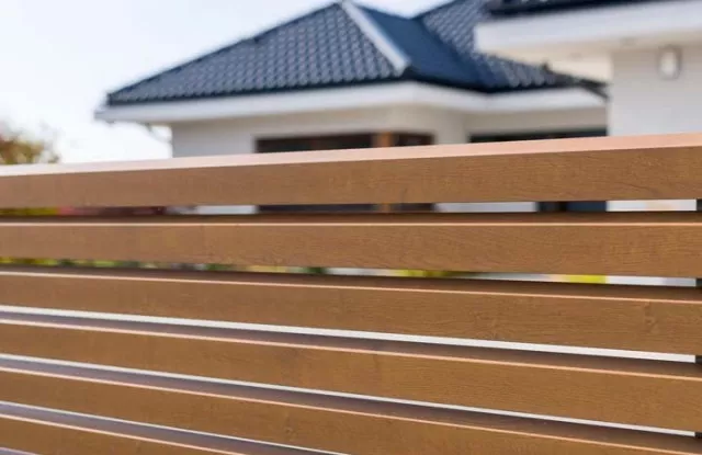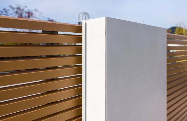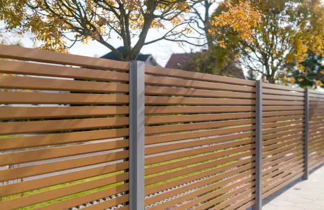 Bei diesem Projekt wurden holzähnliche Aluminium-Zaunelemente vom Typ Arete Rombo verwendet. Die rautenförmigen Profile bieten Privatsphäre im Garten, wirken dennoch leicht und sorgen für eine natürliche Luftzirkulation. Auf längeren Abschnitten wurden die Spannweiten mit grauen Aluminiumpfosten verbunden.