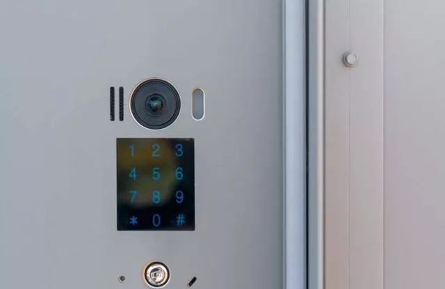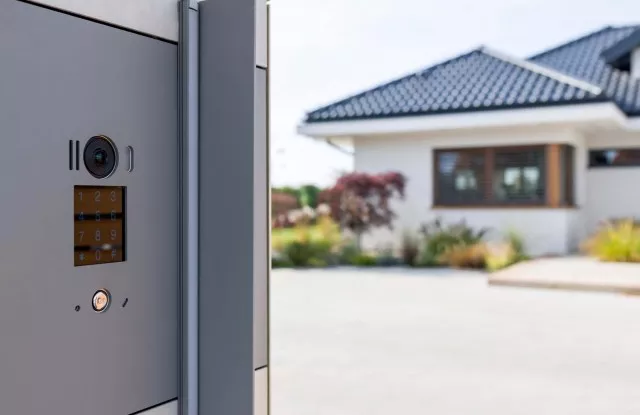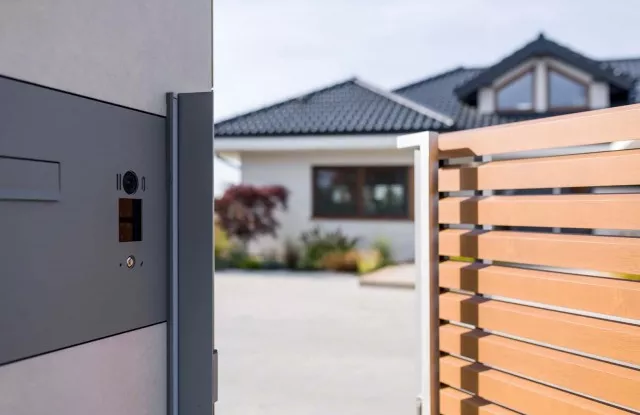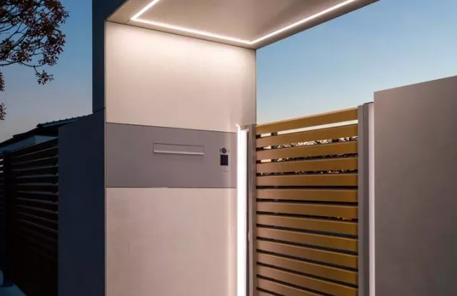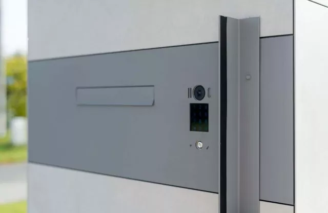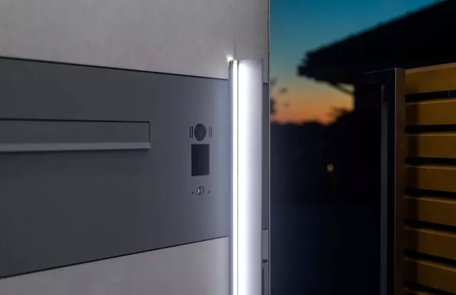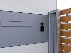 Der Durchwurfbriefkasten ermöglicht eine bequeme Briefentnahme durch die Tür von der Gartenseite aus. Auf der Blende aus grau lackiertem Blech befinden sich zudem ein Ziffernblock und eine Video-Gegensprechtaste.
