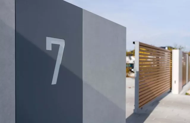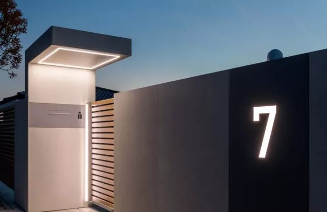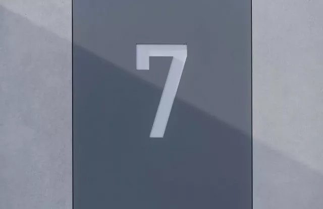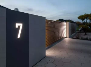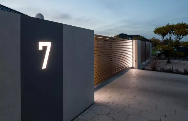 In einen der Quarzsinter wurde die Hausnummer gelasert. Dank der eingebauten Sensoren schaltet sich die Beleuchtung nach Einbruch der Dunkelheit automatisch ein.