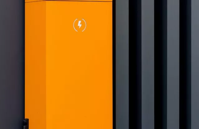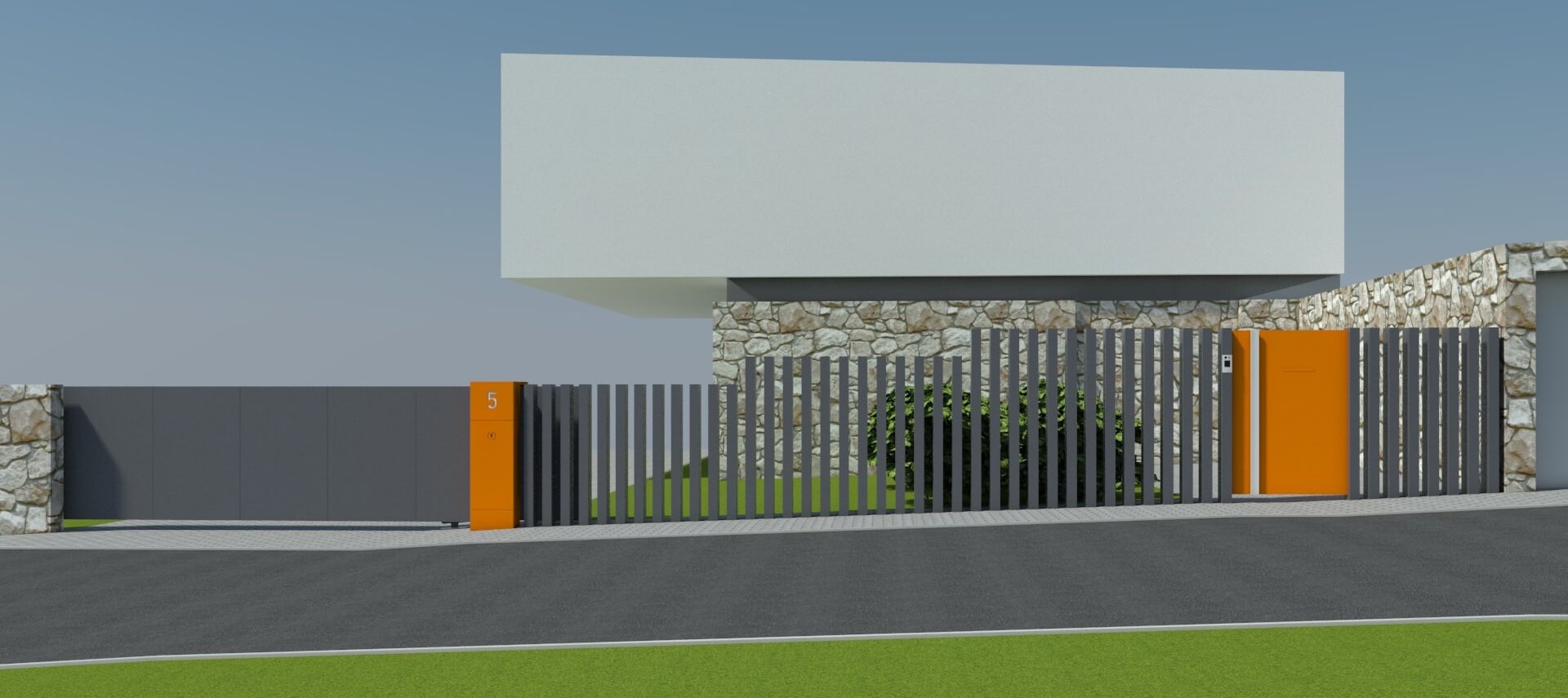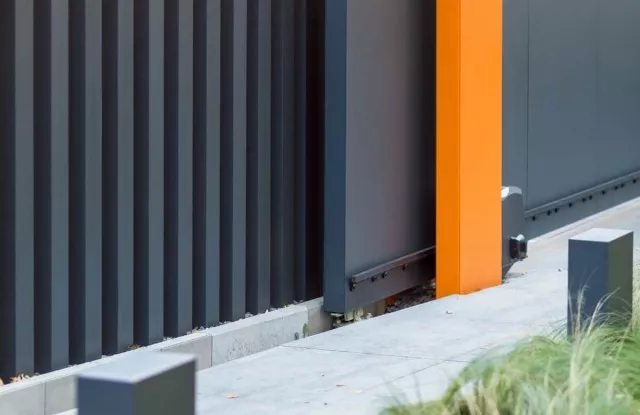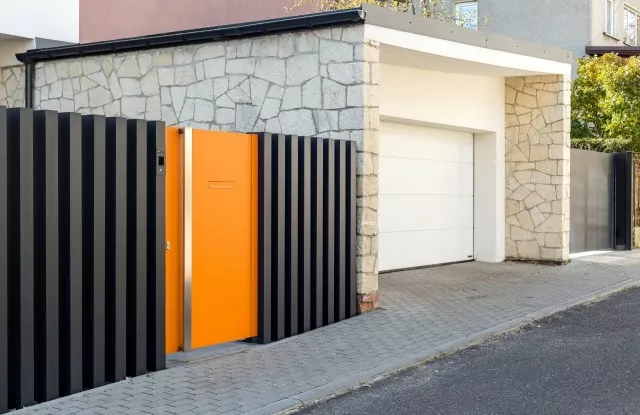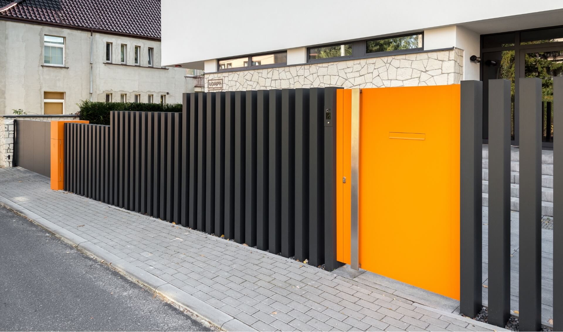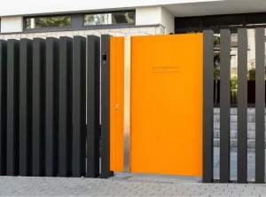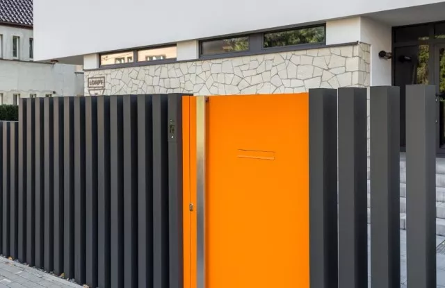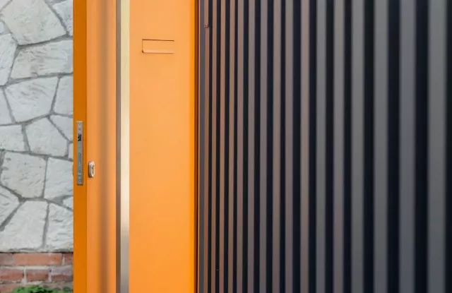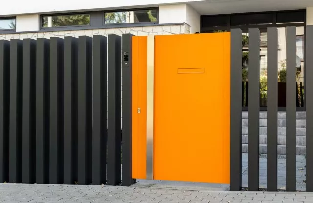 Das Tor Arete Pure ist mit orangefarbenem Blech verkleidet, das einen Kontrast zu den anderen Elementen des Zauns bildet. Im Torflügel wurde ein Durchreicheloch für Briefkästen ausgeschnitten.