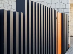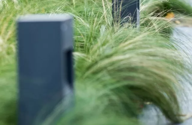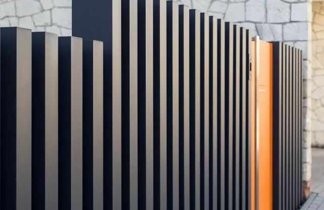 Im Projekt werden vertikale Arete Vertico Zaunelemente in Graphitfarbe verwendet, die direkt aus dem Boden ragen. Die Abstände zwischen den einzelnen Pfosten können unterschiedlich breit sein, wodurch Sie leichte, auffällige Zäune schaffen können.