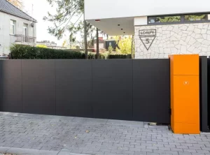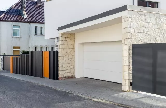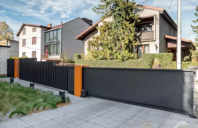 Das moderne, minimalistische Arete Pure-Tor wurde mit glattem Graphitblech verkleidet. Es wurde mit einer schnellen und zuverlässigen Automatisierung ausgestattet, die perfekt für das Stadtzentrum ist – das Auto kann in kurzer Zeit auf das Grundstück fahren, ohne den Verkehr zu behindern.