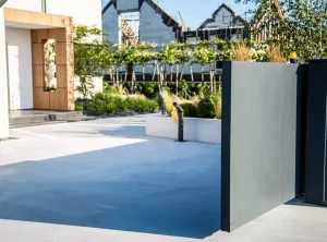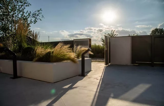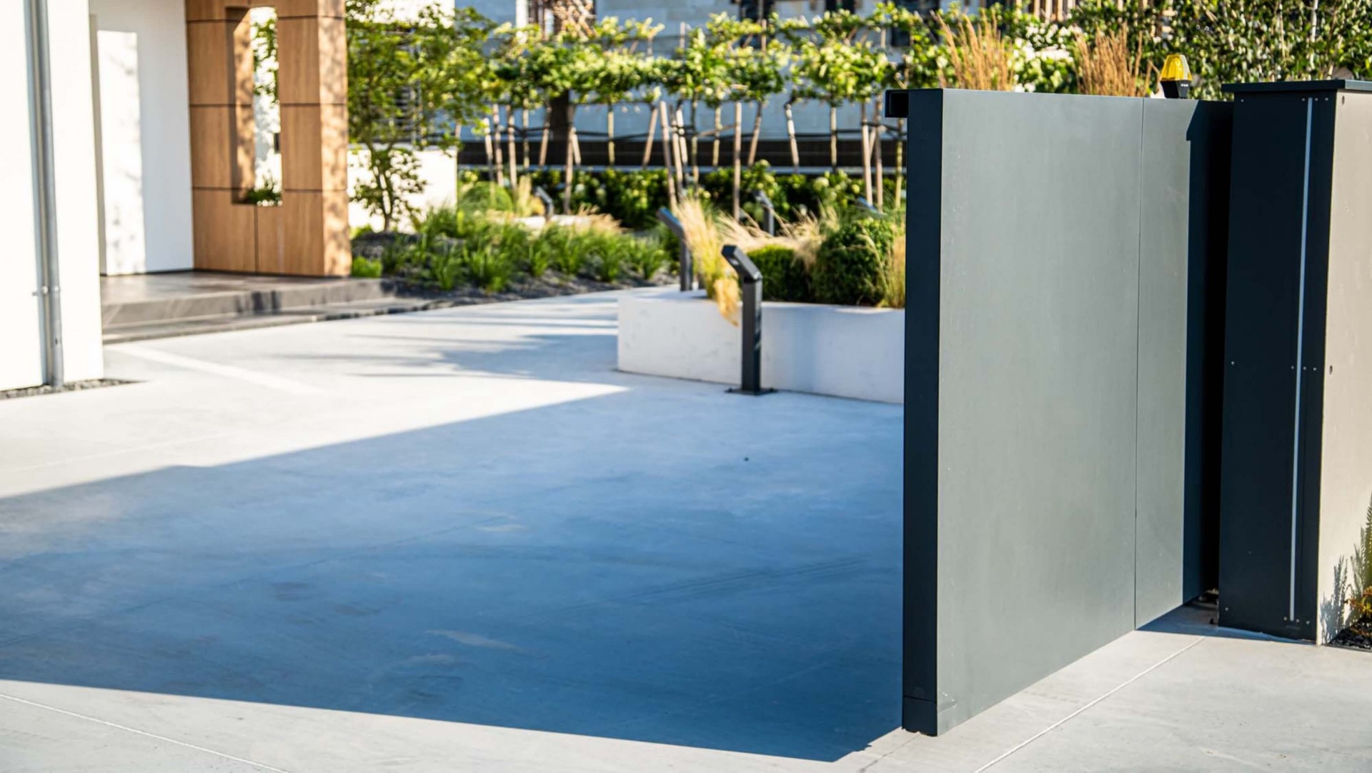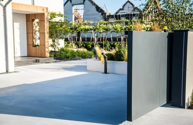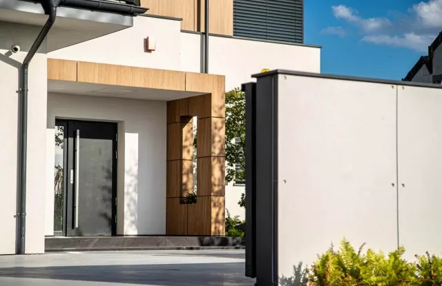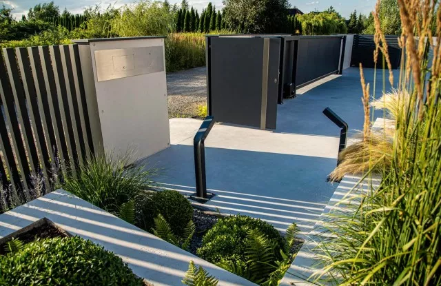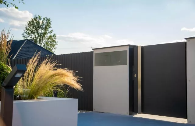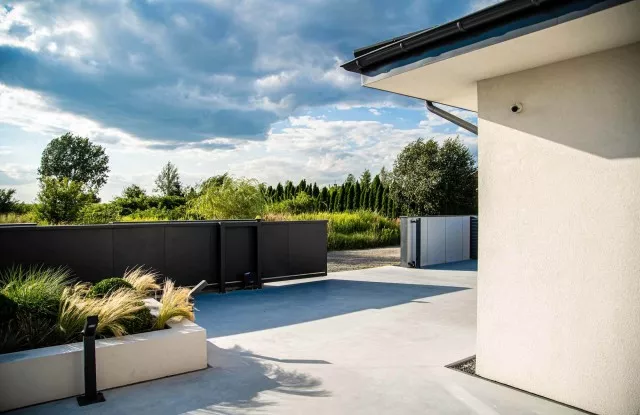 Das Arete Pure-System umfasst moderne Tore und Pforten, die auf beiden Seiten des Zauns großartig aussehen. Sie können mit einer Vielzahl von Materialien ausgeführt werden – in diesem Projekt wurde glattes Aluminiumblech in Graphit verwendet. Das Haupttor hat einen breiten Handlauf aus Edelstahl, der den traditionellen Türgriff ersetzt. Das verschiebbare Eingangstor wurde mit einer Schnellautomatik und Signalbeleuchtung ausgestattet, was die Sicherheit beim Verlassen des Grundstücks erhöht. Es gibt außerdem zwei zusätzliche Arete Pure-Pforten im Zaun – eine von der Straßenseite, die andere vom Garten. Sie führen zum Hauswirtschaftsraum, der für Abfalleimer vorgesehen ist.
