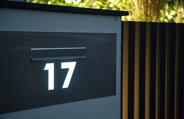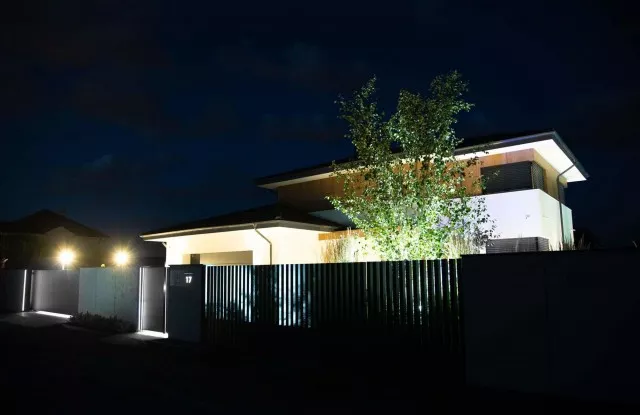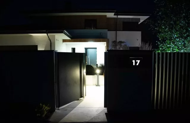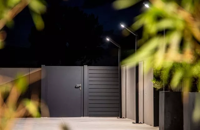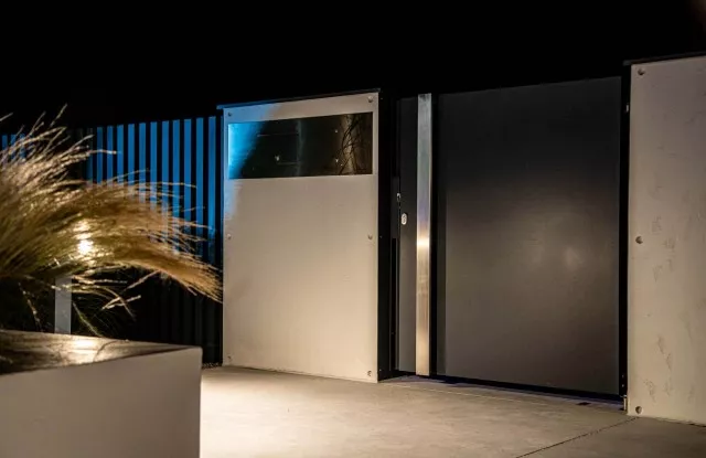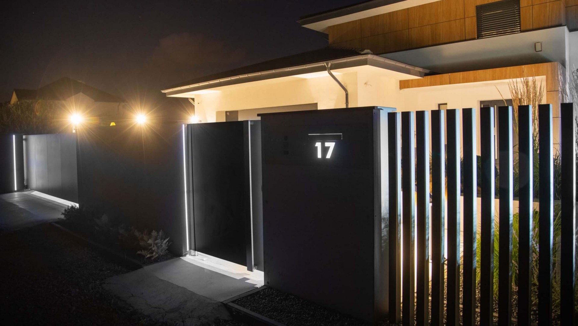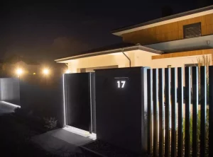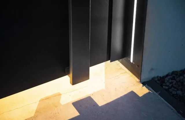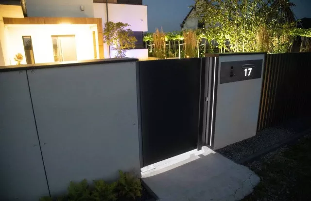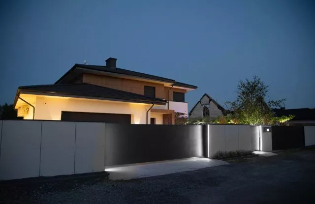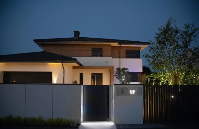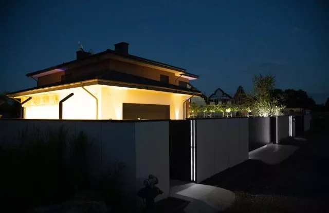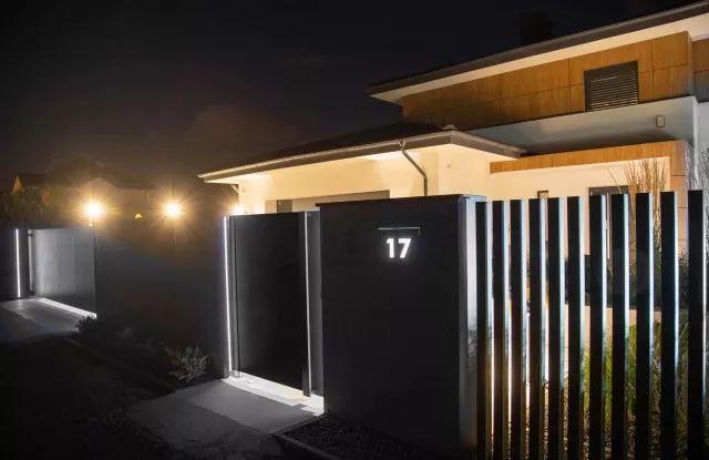 Der Zaun sieht nicht nur tagsüber, sondern auch nach Einbruch der Dunkelheit einzigartig aus. Das Design umfasst mehrere Lichtquellen, die sich gegenseitig ergänzen. Auf beiden Seiten des Tors und der Pforte befinden sich vertikale Lichtstreifen. Die beleuchtete Hausnummer im Briefkastenfeld erleichtert Gästen das Auffinden der richtigen Adresse bei Nacht. Ein interessanter visueller Effekt wird auch durch die Pfosten des Arete Vertico-Systems erzeugt, die schmale Lichtstrahlen von Gartenlampen durchlassen.