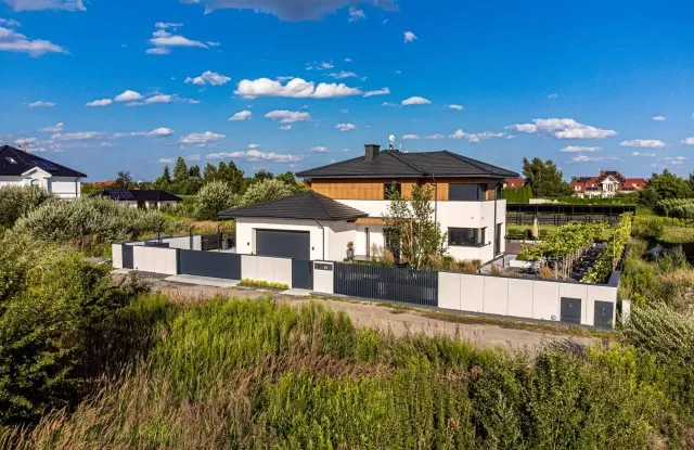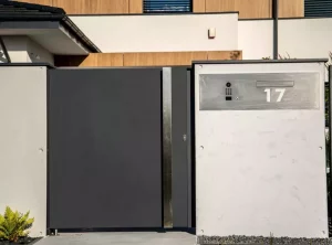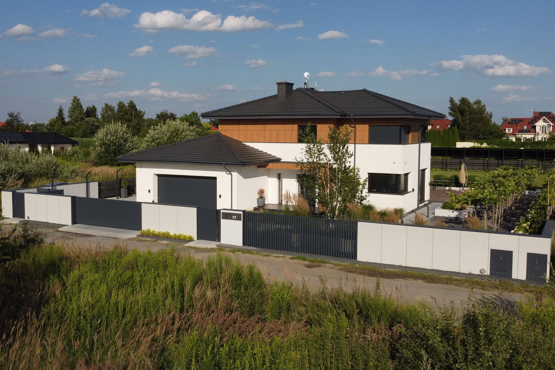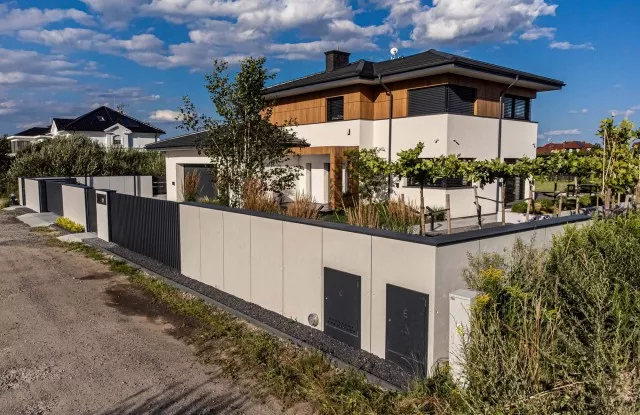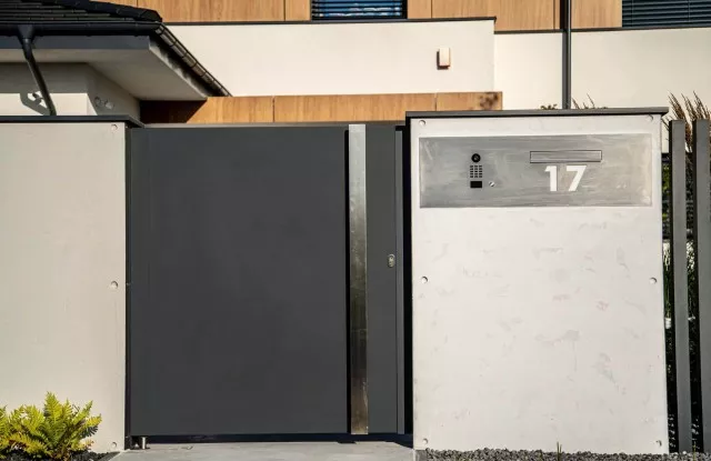 In einem modernen Zaun dürfen Elemente, die seine Funktionalität erhöhen, nicht fehlen. Der Durchwurfbriefkasten ermöglicht es Ihnen, bequem Briefe von der Grundstücksseite aus zu entnehmen. Sein Paneel besteht aus gebürstetem Blech und enthält einen Knopf und eine Video-Gegensprechanlage, ein Zifferntastenfeld und eine beleuchtete Hausnummer. Integraler Bestandteil des Zauns ist eine Tür aus Graphitblech, die den Elektro- und Gaskasten ästhetisch abdeckt.