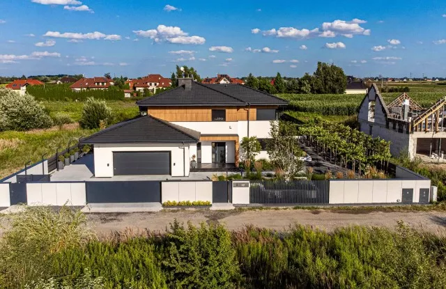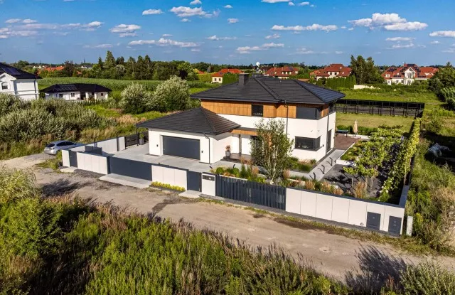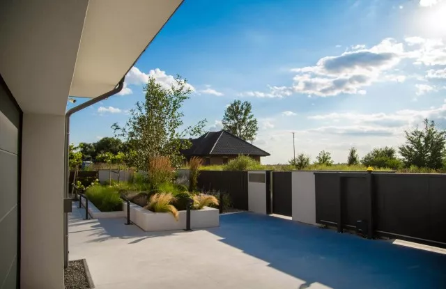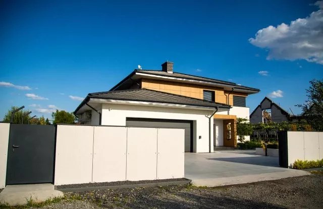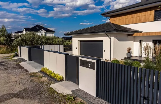 Moderne Aluminiumzäune sind unsere Spezialität. In diesem Projekt wurden Pforten, Tore und Graphit-Zaunpaneele mit Wänden kombiniert, die mit Beton imitierendem Putz verkleidet sind. Der Zaun verfügt außerdem über ästhetische Accessoires wie einen Durchreichebriefkasten und Aluminiumdächer, die seine Haltbarkeit und Funktionalität erhöhen. Ein wichtiges Element des Designs ist die Beleuchtung, die die Attraktivität des Zauns nach Einbruch der Dunkelheit unterstreicht.