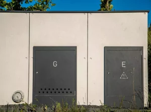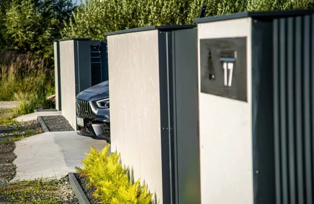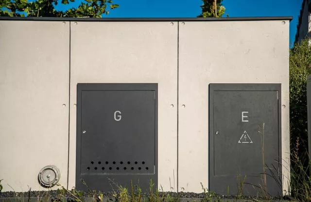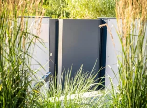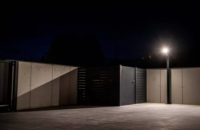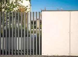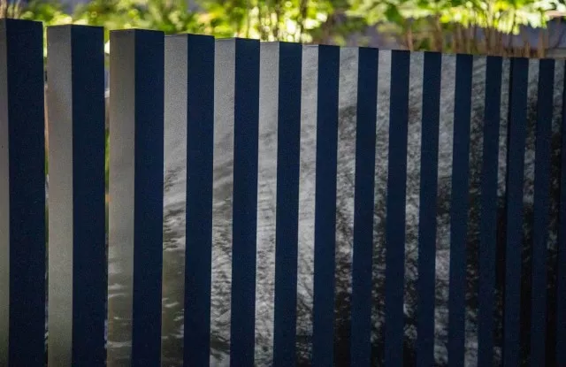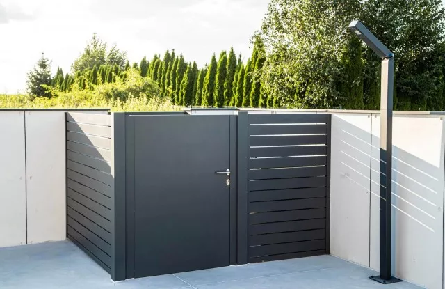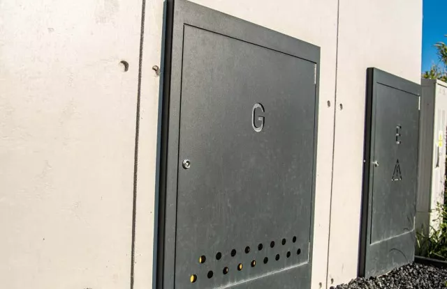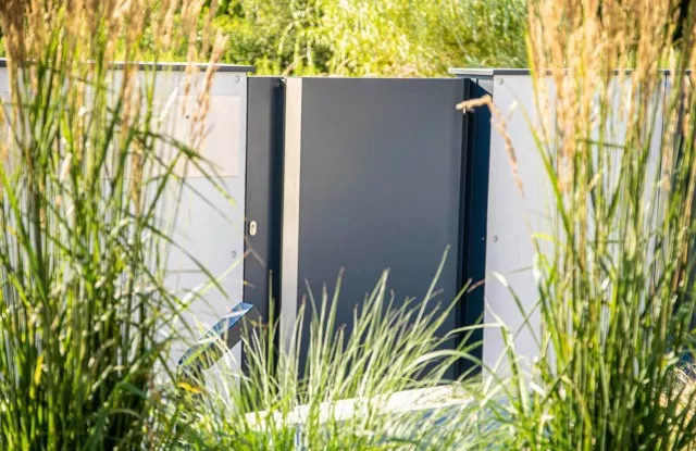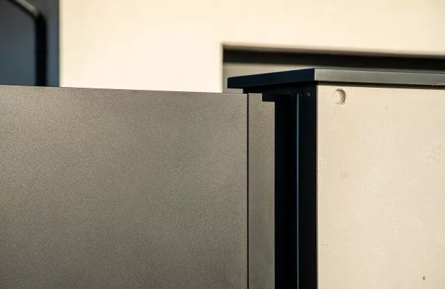 Die Kästen waren hinter einer Tür aus Aluminiumblech in einem zum Rest des Zauns passenden Graphit versteckt.