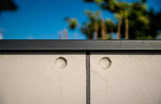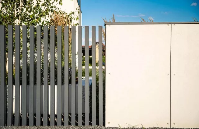 Der vordere Teil des Zauns besteht aus Wänden, die mit einem Beton imitierenden Putz verkleidet sind. Um ihre Haltbarkeit zu erhöhen und unansehnliche Flecken durch Wasser zu vermeiden, wurden sie mit Aluminiumdächern abgedeckt. Auf dem kurzen Abschnitt des Zauns wurden die beeindruckenden vertikalen Zaunelemente Arete Vertico in Graphit verwendet. Die Aluminiumpfosten des Systems kommen direkt aus dem Boden, markieren subtil die Grundstücksgrenze und verleihen dem Zaun optisch Leichtigkeit.