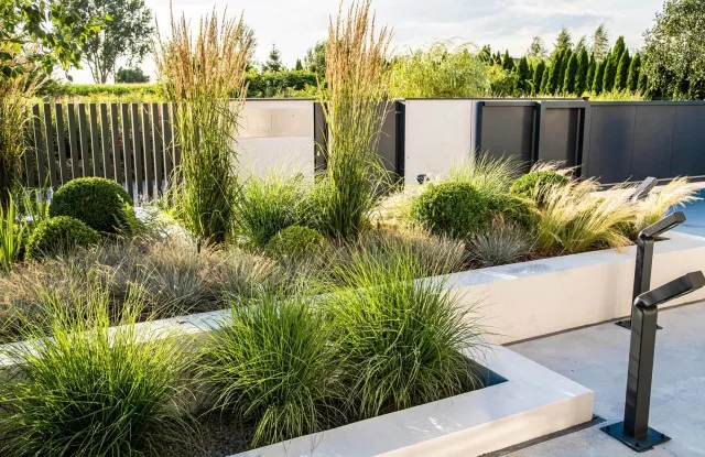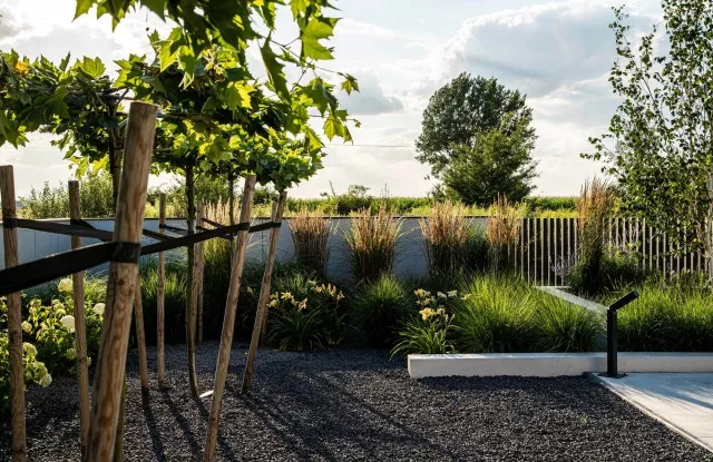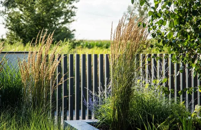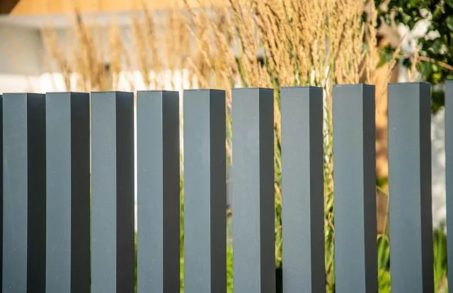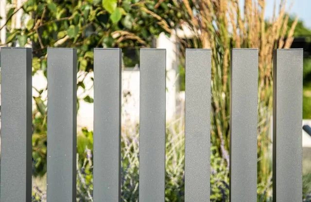 Graphitfarbene Arete Vertico-Pfosten wachsen direkt aus dem Boden und verleihen dem Zaun Leichtigkeit.