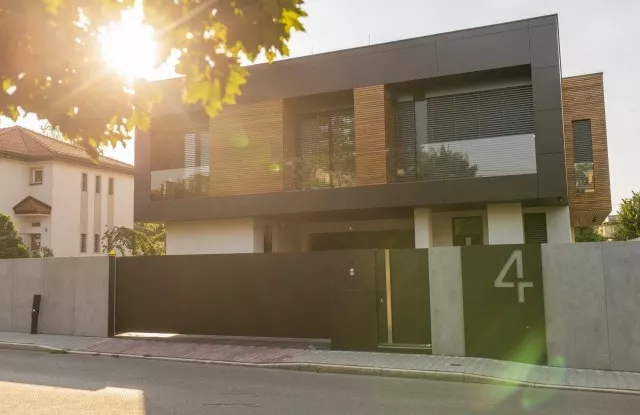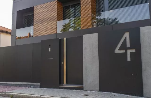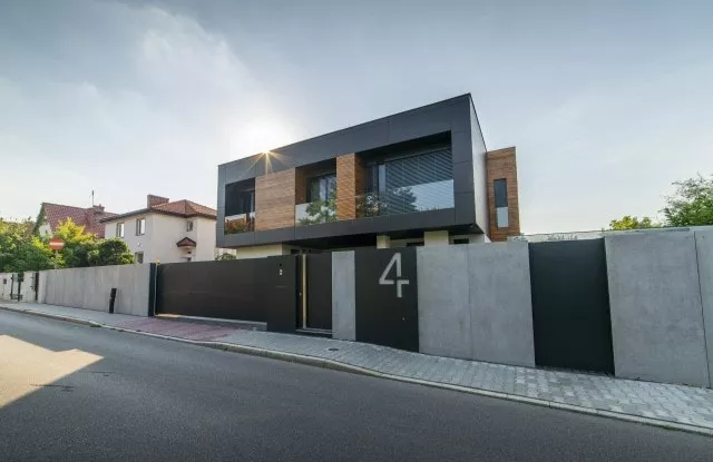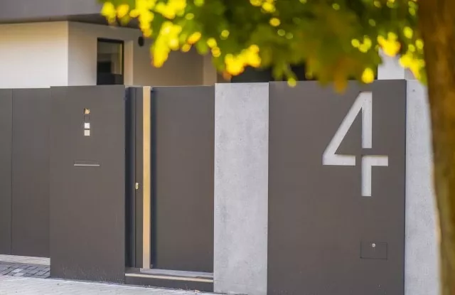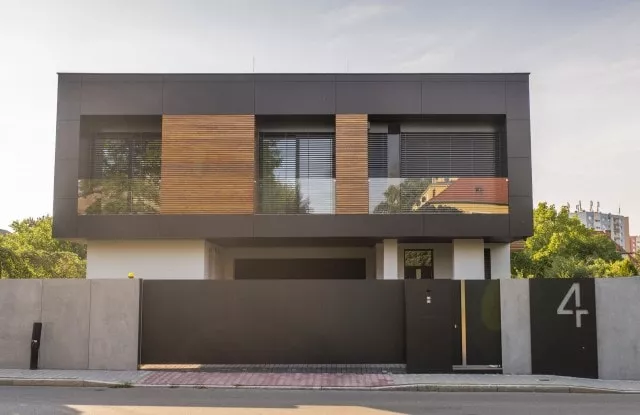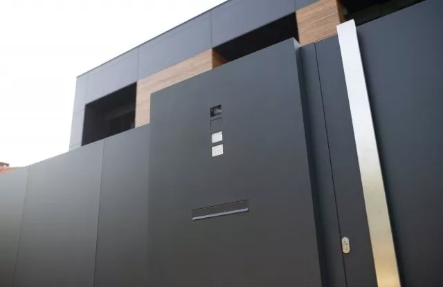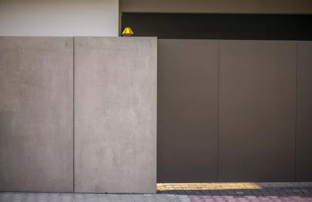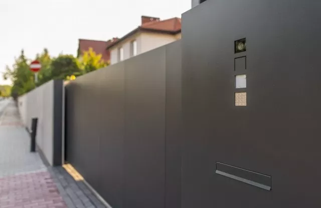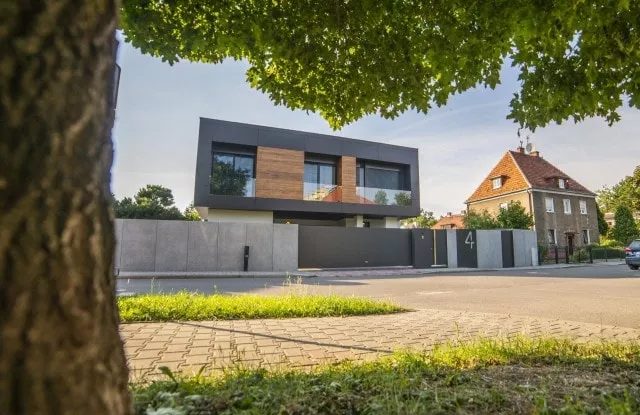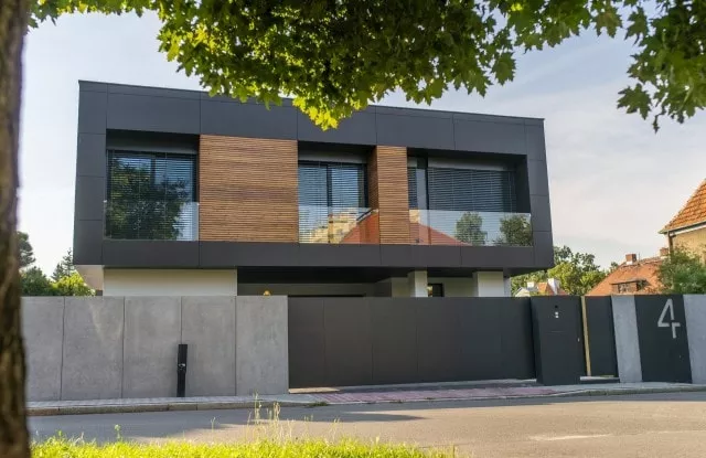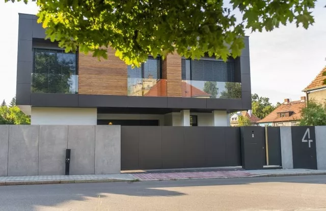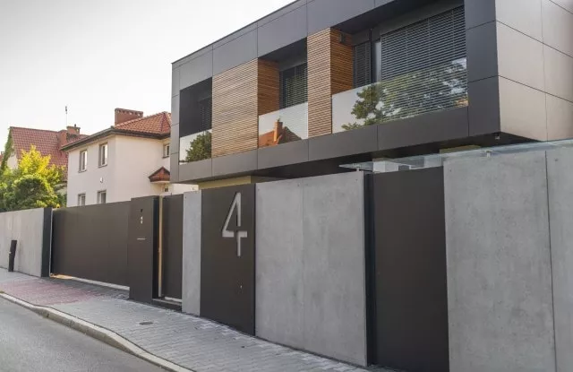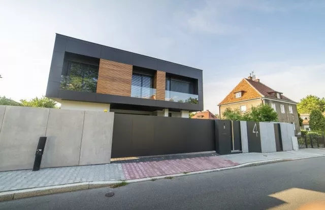 Das moderne Schiebetor Arete Pure ist mit schwarzem Blech verkleidet, dessen Proportionen sich an das Format von Betonplatten orientieren. Das Tor ist mit einer extrem schnellen Automatisierung ausgestattet, sodass das einfahrende Auto den Verkehr nur für die Hälfte der Zeit blockiert. Zusätzliche Ampeln erhöhen die Sicherheit beim Verlassen des Grundstücks.