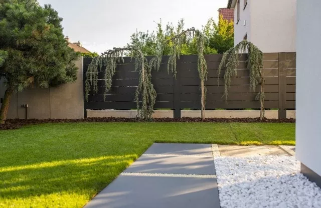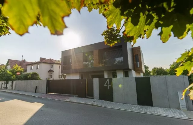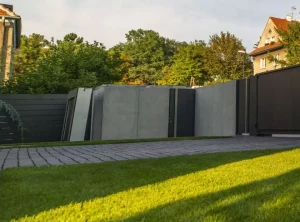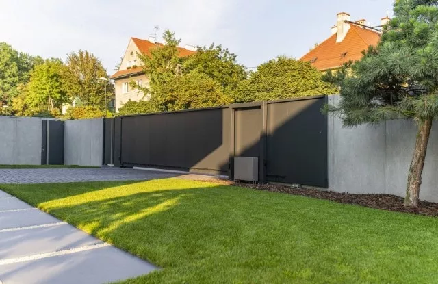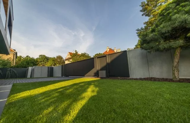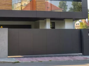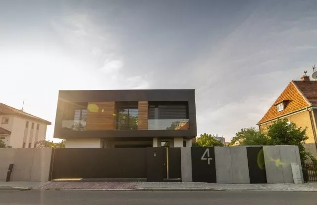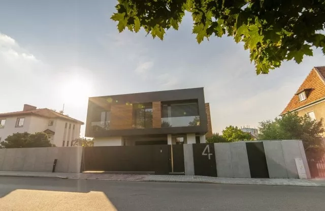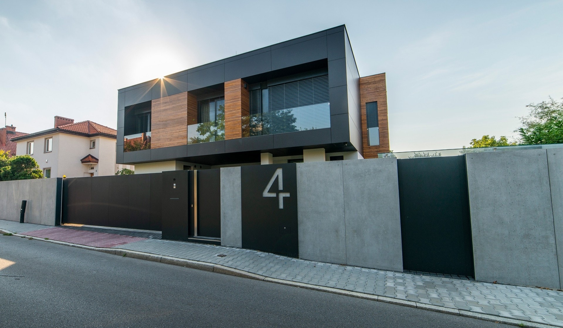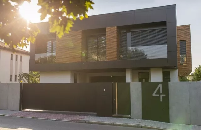 Das moderne Schiebetor Arete Pure ist mit schwarzem Blech verkleidet, dessen Proportionen sich an das Format von Betonplatten orientieren. Das Tor ist mit einer extrem schnellen Automatisierung ausgestattet, sodass das einfahrende Auto den Verkehr nur für die Hälfte der Zeit blockiert. Zusätzliche Ampeln erhöhen die Sicherheit beim Verlassen des Grundstücks.