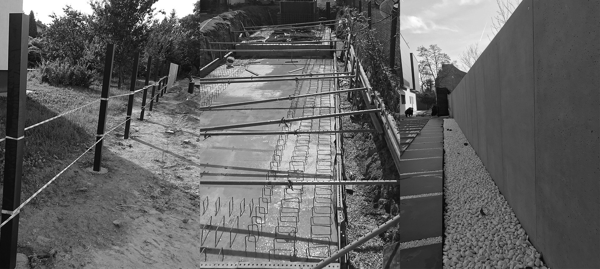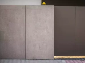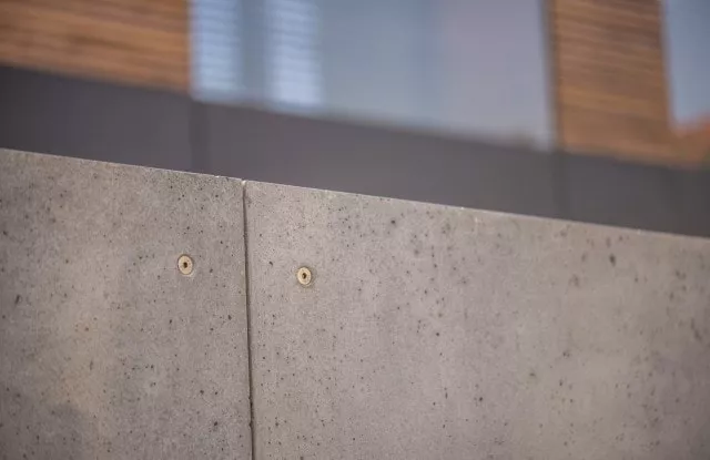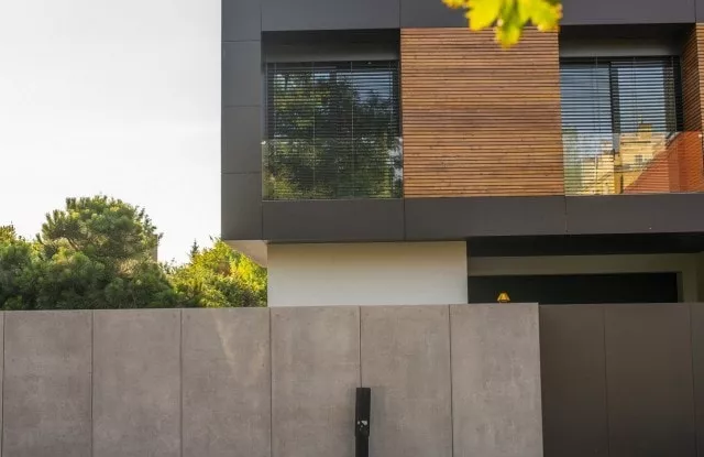 Die Basis der Pfosten bildet die Rockina Cubero Aluminiumkonstruktion, die mit großformatigen Platten aus Architekturbeton verkleidet wurde. Die kompakte Wand schützt die Privatsphäre der Bewohner und ist eine Barriere gegen Lärm von außen.