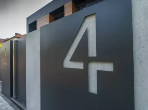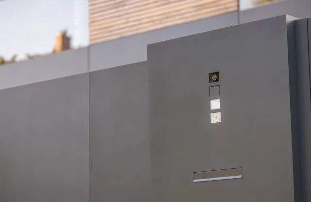 Die lasergeschnittene Hausnummer wird nach Einbruch der Dunkelheit automatisch beleuchtet. Aus dem gleichen Metall wurde eine dezente Tür angebracht, hinter der der Gaszähler versteckt ist.