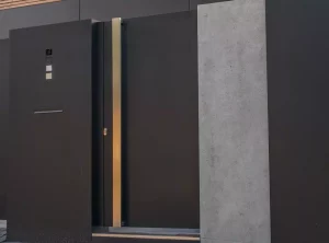 Die moderne Arete Pure wurde mit einem glatten, schwarzen Blech verkleidet. Darüber hinaus ist sie mit einem breiten Edelstahlhandlauf und seitlichen Scharnierabdeckungen ausgestattet.