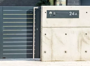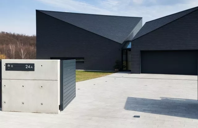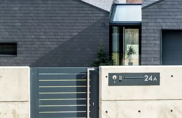 Der moderne Briefkasten ist eine ästhetische und funktionale Ergänzung zum Zaun. Das durchgehende Design ermöglicht die bequeme Entnahme von Briefen direkt vom Grundstück. Die Platte des Kastens besteht aus pulverbeschichtetem Edelstahl in einer Farbe, die mit den anderen Elementen des Projekts harmoniert. Die Hausnummer wurde ebenfalls ausgeschnitten, ebenso wie eine Videosprechanlage und ein Ziffernblock.