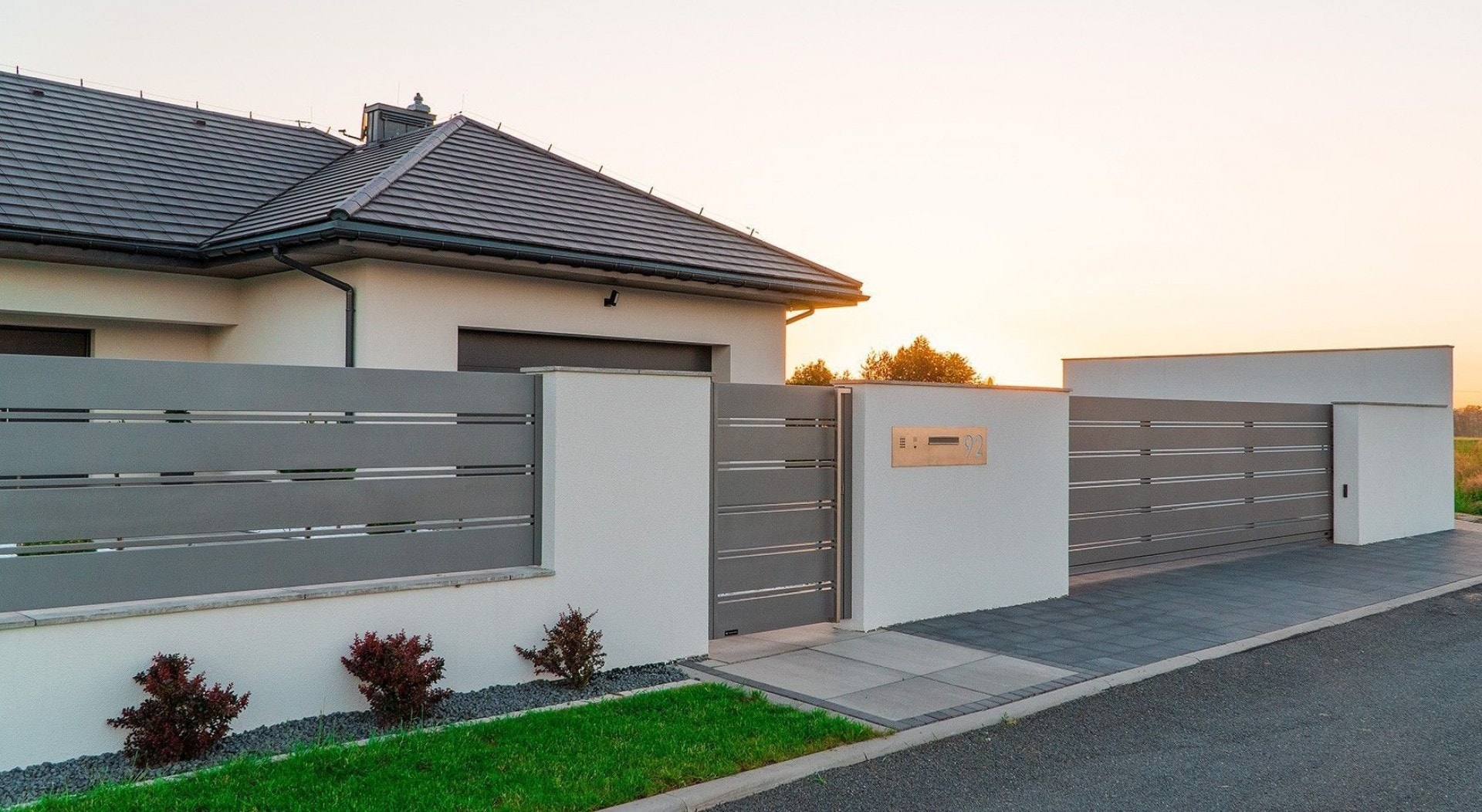 Der vordere Teil des Zauns besteht aus Arete Horizon Aluminiumspannen in zwei Breiten und einfachen verputzten Wänden. Aufgrund der Form des Grundstücks überlappt das Schiebetor nach dem Öffnen das Tor, sodass wir einen zusätzlichen elektronischen Schutz eingesetzt haben. Fundamente und verputzte Säulen wurden mit Dächern aus Architekturbeton abgedeckt. Die Dächer wurden auch in einer Stützmauer auf dem Grundstück verwendet. Im vorderen, repräsentativen Teil des Zauns haben wir uns für Vollfundamente entschieden.