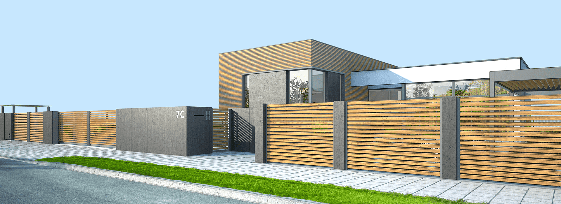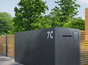 Eine attraktive Ergänzung zum minimalistischen Zaun ist ein eingebauter Briefkasten, der es Ihnen ermöglicht, bequem Briefe aus dem Garten zu entnehmen. Der Briefkasten ist ein länglicher Schlitz in der Nähe des Tores.
